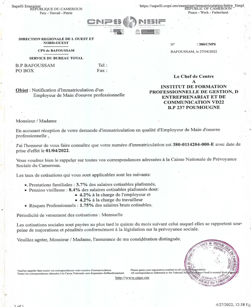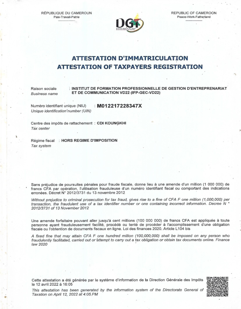 Agréement du MINEFOP (Ministere de l'Emploi et de la Formation Professionnelle) pour la création de l'IFPGEC VD22